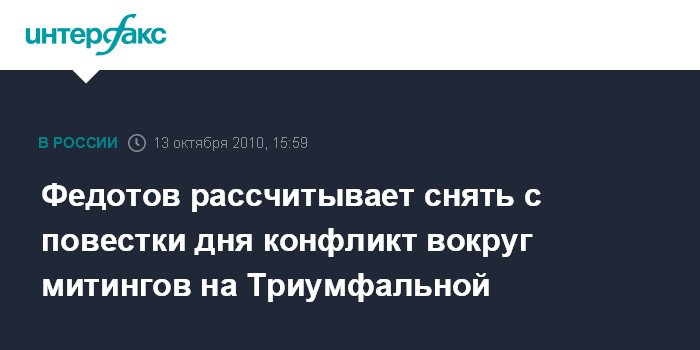 Москва. 13 октября. INTERFAX.RU - Новый глава президентского совета по правам человека Михаил Федотов обещает решить проблему митингов на Триумфальной площади Москвы, которые не согласовываются властями и разгоняются милицией.