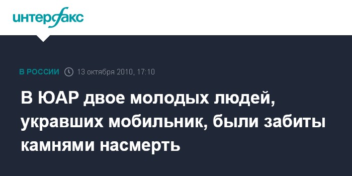 Лондон. 13 октября. INTERFAX.RU - В ЮАР осуждены шестеро человек, которые насмерть забили камнями двух молодых людей, заподозренных в краже мобильного телефона, сообщает в среду британская телерадиокорпорация Би-би-си.