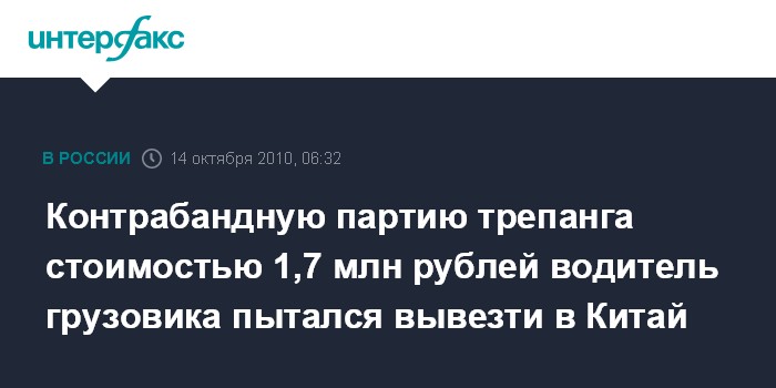 Владивосток. 14 октября. ИНТЕРФАКС-ДАЛЬНИЙ ВОСТОК - Сотрудники Дальневосточной оперативной таможни (ДВОТ) задержали крупную партию сушеного трепанга на российско-китайской границе в Приморье.
