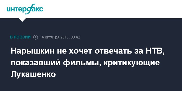 Москва. 14 октября. INTERFAX.RU - Глава администрации президента РФ Сергей Нарышкин отрицает, что показанные по телеканалу НТВ фильмы с критикой президента Белоруссии Александра Лукашенко выходили в эфир по некоему указанию "сверху".