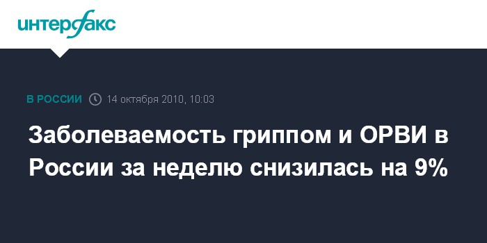 Москва. 14 октября. INTERFAX.RU - В России снижается заболеваемость гриппом и ОРВИ, показатели по-прежнему остаются ниже эпидемических порогов, сообщили "Интерфаксу" в Минздравсоцразвития.