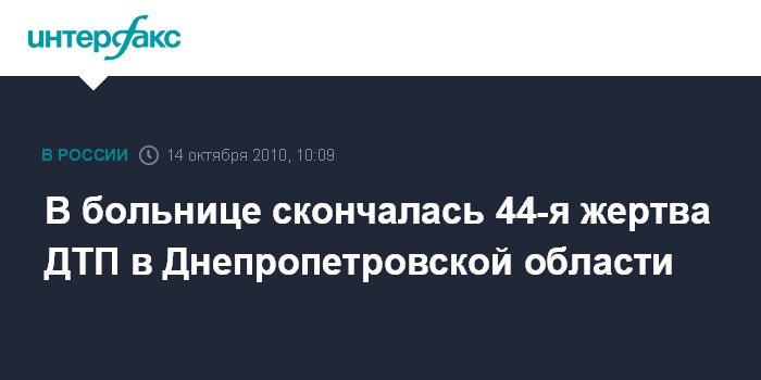 Киев. 14 октября. INTERFAX.RU - В Днепропетровске от травм, несовместимых с жизнью, скончалась 44-я жертва ДТП в Марганце (Днепропетровская обл.), сообщил корреспондент агентства "Интерфакс".