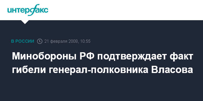 Москва. 21 февраля. INTERFAX.RU - В управлении информации и общественных связей Минобороны РФ подтвердили "Интерфаксу" в четверг факт смерти генерал-полковника Виктора Власова.