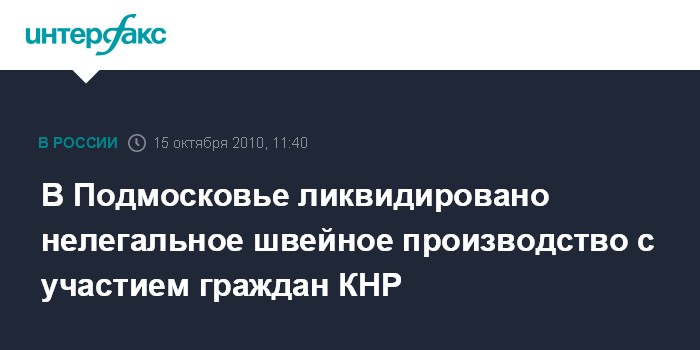 Москва. 15 октября. INTERFAX.RU - Подмосковные оперативники освободили более 30 граждан Китая, которых соотечественник заставлял работать в нелегальном цехе по пошиву одежды, сообщили "Интерфаксу" в Управлении информации и общественных связей ГУВД Московской области в пятницу.
