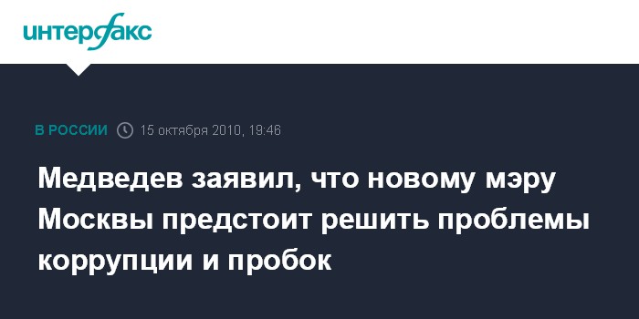 Москва. 15 октября. INTERFAX.RU - Президент РФ Дмитрий Медведев заявил, что среди основных проблем, которые предстоит решить новому мэру Москвы, - коррупция и пробки.
