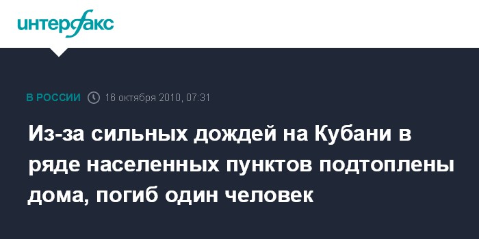 Ростов-на-Дону. 16 октября. ИНТЕРФАКС-ЮГ - В результате ливневых дождей, прошедших в Туапсинском районе Краснодарского края в нескольких горных населенных пунктах, оказались подтоплены жилые дома частного сектора, погиб один человек, сообщили агентству "Интерфакс-Юг" в правоохранительных органах региона в субботу.