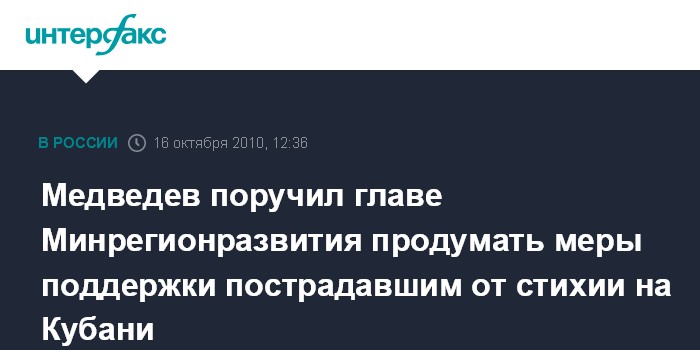 Москва. 16 октября. INTERFAX.RU - Президент России Дмитрий Медведев поручил главе Минрегионразвития Виктору Басаргину продумать меры поддержки пострадавшим от наводнения в Краснодарском крае, сообщила пресс-секретарь президента Наталья Тимакова. "Президент РФ Д.Медведев в ходе телефонного разговора с главой Минрегионразвития поручил В.Басаргину в координации с властями Краснодарского края оценить ущерб, нанесенный стихией и продумать меры поддержки с тем, чтобы в кратчайшее время восстановить нормальный режим жизнедеятельности", - сказала Н.Тимакова.