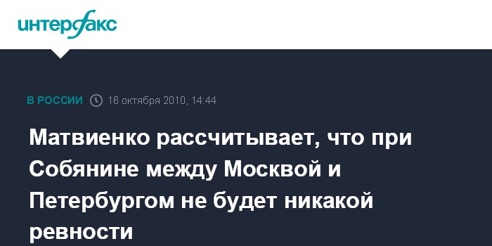 Санкт-Петербург. 16 октября. INTERFAX.RU - Губернатор Петербурга Валентина Матвиенко уверена, что с утверждение мэром Москвы Сергея Собянина в отношениях между двумя столицами исчезнет ревность и разовьется здоровая конкуренция. "Москвичам повезло. Это достойная кандидатура, человек удивительных качеств: порядочный, совестливый, не популист", - заявила В.Матвиенко журналистам в субботу. "У нас будет хорошее сотрудничество между Петербургом и Москвой: состязательность и конкуренция, но никакой ревности", - добавила она.