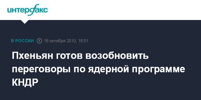 Пекин. 16 октября. INTERFAX.RU - Представитель МИД КНДР заявил в субботу о готовности Пхеньяна возобновить шестисторонние переговоры по денуклеаризации Корейского полуострова, сообщает китайская газета "Чайна дейли" со ссылкой на официальные северокорейские СМИ. В заявлении МИД Северной Кореи говорится, что КНДР готова возобновить шестисторонние переговоры, но не собирается спешить.