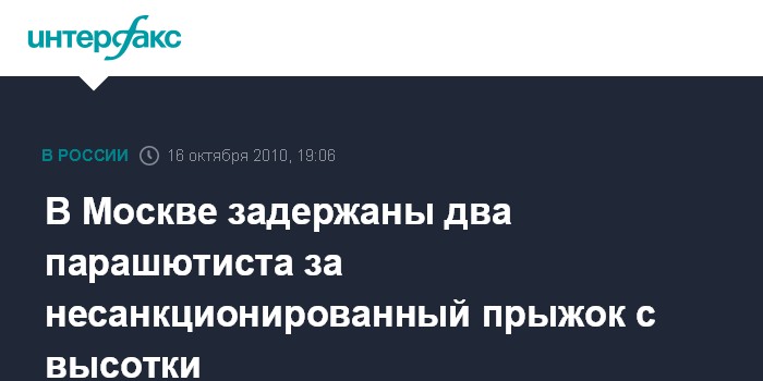Москва. 16 октября. INTERFAX.RU - В Москве в микрорайоне Строгино сотрудники милиции задержали двоих парашютистов, совершивших несанкционированный прыжок со строящегося высотного здания. Как сообщил "Интерфаксу" источник в правоохранительных органах, в субботу около 18:00 двое парашютистов выпрыгнули с 26-го этажа строящегося здания на улице Маршала Катукова. Охрана строящегося объекта сообщила о случившемся в милицию. Парашютисты были задержаны сотрудниками милиции и доставлены в ОВД "Строгино".