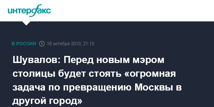"Теперь перед ним (новым мэром - ИФ) будет стоять огромная и сложная задача по изменению Москвы, по превращению Москвы в совершенно другой город. Новому градоначальнику придется заниматься не только тем, что лежит совершенно на поверхности - это транспортный коллапс, пробки и так далее. В Москве очень сложная проблема, связанная с предоставлением медицинских услуг, общим образованием, средним образованием. Эту проблему придется решать не только градоначальнику", - сказал И.Шувалов.