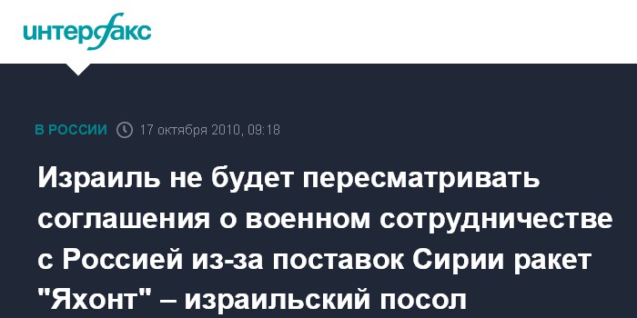 Израиль не будет пересматривать соглашения о военном сотрудничестве с Россией из-за поставок Сирии ракет "Яхонт" – израильский посол