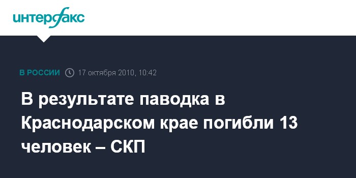 Ростов-на-Дону. 17 октября. INTERFAX.RU - Число жертв паводка в Краснодарском крае достигло 13 человек, сообщил агентству "Интерфакс-Юг" руководитель следственного отдела по Туапсинскому району следственного управления СКП по Краснодарскому краю Геннадий Васюнин. "На данный час погибшими являются 13 человек, из них опознаны 10. Еще три женщины не опознаны", - сказал Г.Васюнин. По его словам, без вести пропавшими числятся 12 человек.