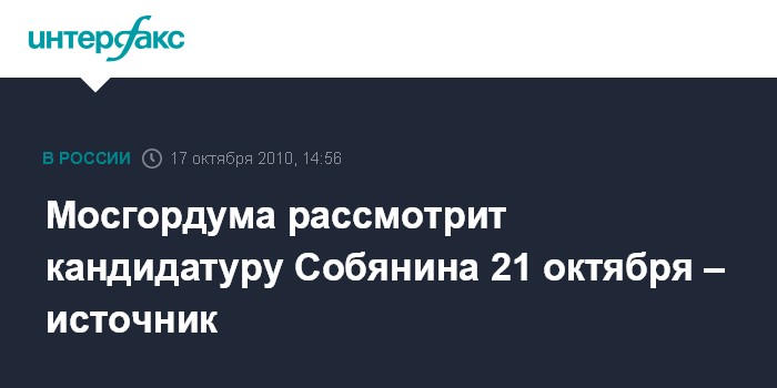 "Документы о представлении С.Собянина на пост мэра получены в Мосгордуме еще в субботу. В понедельник (18 октября) на заседании комиссии по организации работы думы будет официально определена дата внеочередного заседания, на котором изберут градоначальника", - сказал он. По словам собеседника агентства, депутаты рассчитывают на встречи в начале недели с кандидатом на пост мэра, которые по традиции проводятся с думскими фракциями перед избранием главы субъекта РФ.
