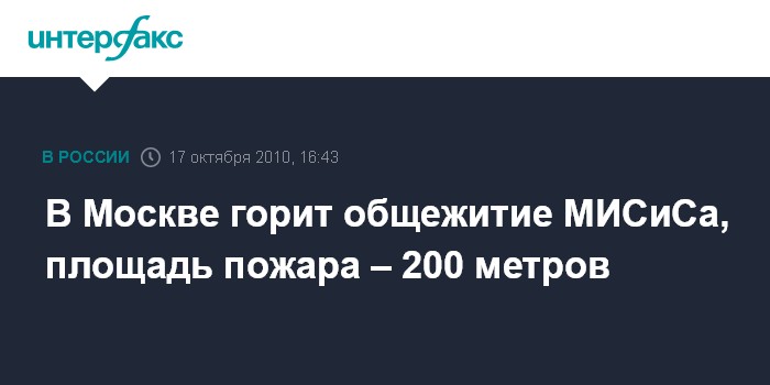 Москва. 17 октября. ИНТЕРФАКС - Площадь пожара в общежитии на юге Москвы составляет 200 кв. метров, сообщил "Интерфаксу" в воскресенье источник в правоохранительных органах города. По его данным, общежитие принадлежит Московскому институту стали и сплавов (МИСиС). Ранее начальник пресс-службы ГУ МЧС по Москве Евгений Бобылев сообщил "Интерфаксу", что на юге столицы горит общежитие, пожару присвоен второй номер сложности. Он рассказал, что сообщение о пожаре по адресу улица Орджоникидзе, дом 7/8 поступило на пульт оперативного дежурного в 16:05. Возгорание произошло в трехэтажном здании общежития. Е.Бобылев добавил, что информации о пострадавших пока не поступало.