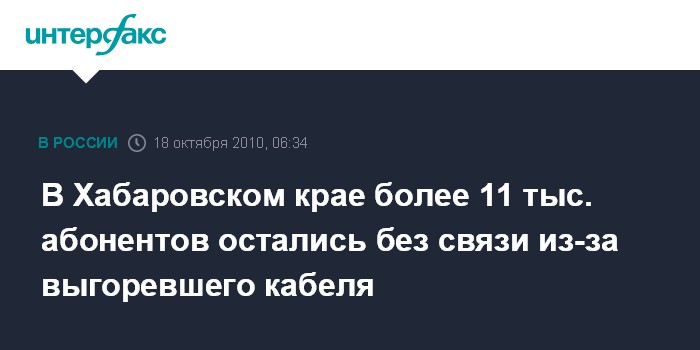 Хабаровск. 18 октября. ИНТЕРФАКС - ДАЛЬНИЙ ВОСТОК - Более 11 тыс. абонентов телефонных станций и 16 тыс. абонентов Интернета лишились связи из-за повреждения оптико-волоконного кабеля в Хабаровске, сообщила агентству "Интерфакс - Дальний Восток" в понедельник представитель пресс-службы хабаровского филиала ОАО "Дальсвязь" Юлия Стремилова.