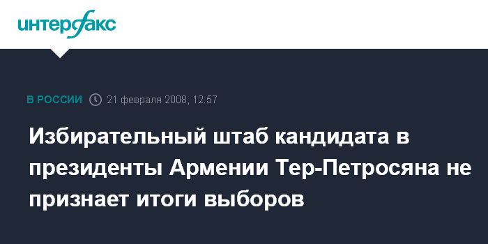 Ереван. 21 февраля. INTERFAX.RU- Избирательный штаб экс-президента Армении Левона Тер-Петросяна не признает объявленные Центризбиркомом страны результаты президентских выборов, состоявшихся 19 февраля, и требует проведения новых выборов.