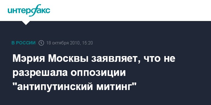 Москва. 18 октября. INTERFAX.RU - В пресс-службе мэрии опровергают информацию, появившуюся в ряде СМИ, о том, что столичные власти якобы разрешили оппозиции провести 23 октября "антипутинский митинг".