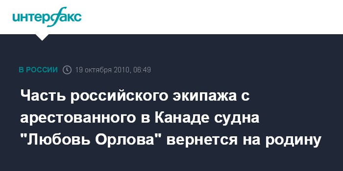 Владивосток. 19 октября. ИНТЕРФАКС-ДАЛЬНИЙ ВОСТОК - Часть российских моряков с теплохода "Любовь Орлова", арестованного в Канаде за долги судовладельца, возвращается на родину.