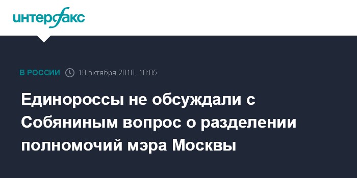 Москва. 19 октября. INTERFAX.RU - Фракция "Единая Россия" в Мосгордуме не поднимала на встрече с кандидатом на пост столичного градоначальника Сергеем Собяниным вопрос о разделении полномочий мэра Москвы и главы городского правительства, сообщил в понедельник журналистам руководитель фракции Андрей Метельский.