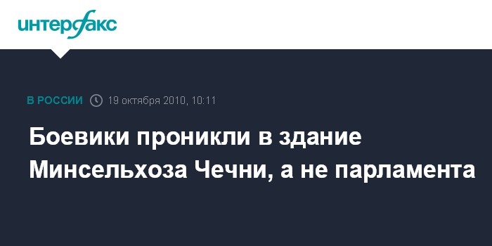 Москва. 19 октября. ИНТЕРФАКС - Три боевика в Грозном проникли в здание Минсельхоза, а не чеченского парламента, утверждает источник в правоохранительных органах.