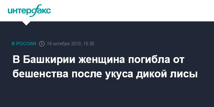 Больная бешенством дикая лиса напала на 31-летнюю жительницу Учалинского района утром 30 июля прямо во дворе и укусила ее в лицо. Муж женщины убил животное. Несмотря на усилия медиков спасти пострадавшую женщину не удалось.