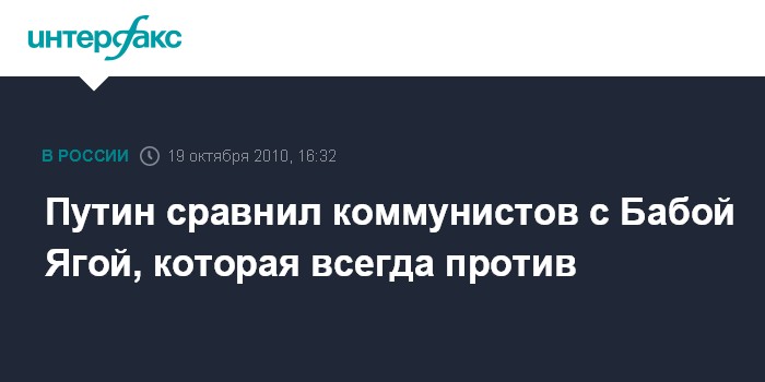 Москва. 19 октября. INTERFAX.RU - Премьер-министр РФ Владимир Путин считает, что фракция КПРФ в Госдуме, как правило, действует по принципу героини мультфильма "А Баба Яга против".