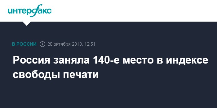Париж. 20 октября. INTERFAX.RU - Российская Федерация в 2010 г. заняла 140-е место в мировом индексе свободы печати, опубликованном в среду международной правозащитной организацией "Репортеры без границ".