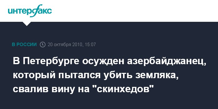 В июне 2009 г. в угрозыск поступила информация о том, что участники этнической преступной группы ищут возможность совершения убийства гражданина Азербайджана, 1977 г. рождения, временно зарегистрированного в Петербурге. "Убийство планировалось представить как совершенное в результате нападения "скинхедов", - сообщили ранее "Интерфаксу" в ГУВД Петербурга.