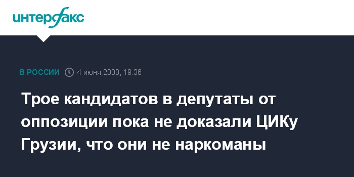 Тбилиси. 4 июня. ИНТЕРФАКС - Трое кандидатов в депутаты грузинского парламента нового созыва не представили в ЦИК справки из Наркологического центра, подтверждающие, что они не употребляют наркотики.