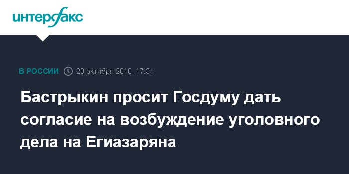 Москва. 20 октября. INTERFAX.RU - В СКП РФ подтвердили, что и.о.главы следственного комитета Александр Бастрыкин просил Госдуму дать согласие на возбуждение уголовного дела в отношении депутата Ашота Егиазаряна.