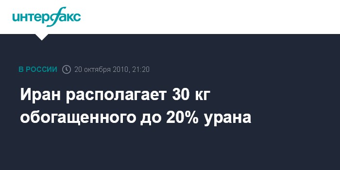 Тегеран. 20 октября. INTERFAX.RU - Власти Ирана располагают 30 кг урана, обогащенного до 20%, заявил в среду в интервью иранскому телеканалу Press TV глава Иранской организации по атомной энергии Али Акбар Салехи.