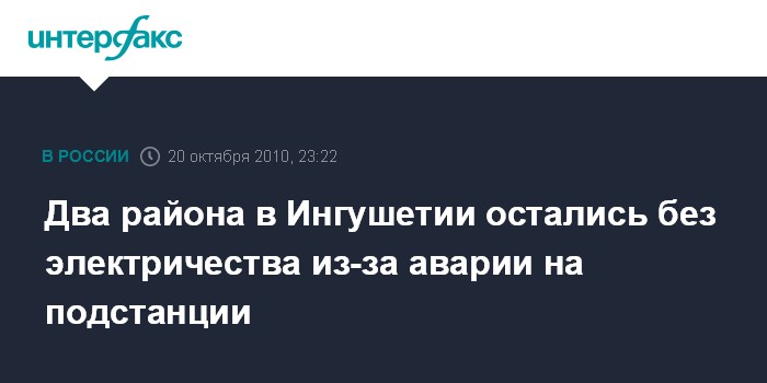 Назрань. 20 октября. ИНТЕРФАКС-ЮГ - В результате аварии на электроподстанции в Ингушетии без электричества остались жители Малгобекского и Назрановского районов республики.