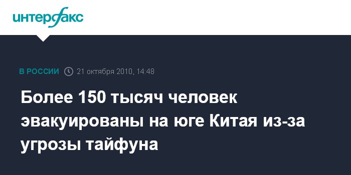 Пекин. 21 октября. INTERFAX.RU - Более 150 тысяч человек в южной китайской провинции Фуцзянь были вынуждены покинуть свои дома из-за угрозы тайфуна "Меги", сообщает китайская газета China Daily со ссылкой на заявление штаба по борьбе со стихийными бедствиями.