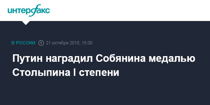 Москва. 21 октября. INTERFAX.RU - Премьер РФ Владимир Путин подписал документы о награждении Сергея Собянина правительственной наградой -медалью Столыпина I степени.