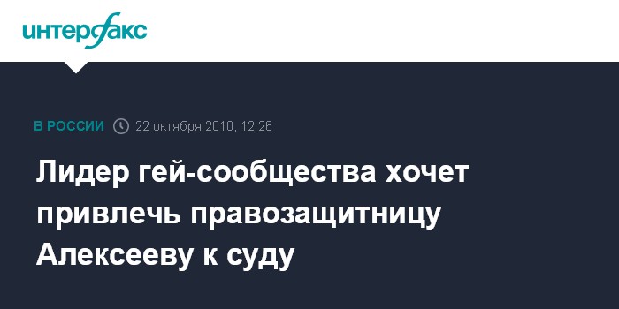 Москва. 22 октября. INTERFAX.RU - Лидер российского гей-сообщества Николай Алексеев подал в суд иск к главе Московской Хельсинской группы Людмиле Алексеевой из-за ее высказываний в его адрес в эфире радиостанции "Эхо Москвы".