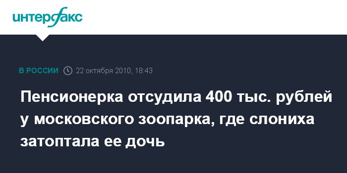 Москва. 22 октября. INTERFAX.RU - Пятницкий суд взыскал 400 тыс. руб. со столичного зоопарка, частично удовлетворив иск 70-летней москвички Татьяны Новиковой, чью дочь насмерть затоптала разъяренная слониха.