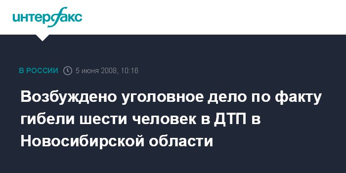 Москва. 5 июня. INTERFAX.RU - Правоохранительные органы возбудили уголовное дело в связи с ДТП в Новосибирской области, в котором погибли шесть человек. "Уголовное дело возбуждено по ч.3 ст.264 УК РФ - нарушение правил дорожного движения и эксплуатации транспортных средств, повлекшее по неосторожности гибель более двух лиц. Проводятся следственные действия, три человека еще не опознаны", - сообщили агентству "Интерфакс-Сибирь" в Колыванском РОВД.