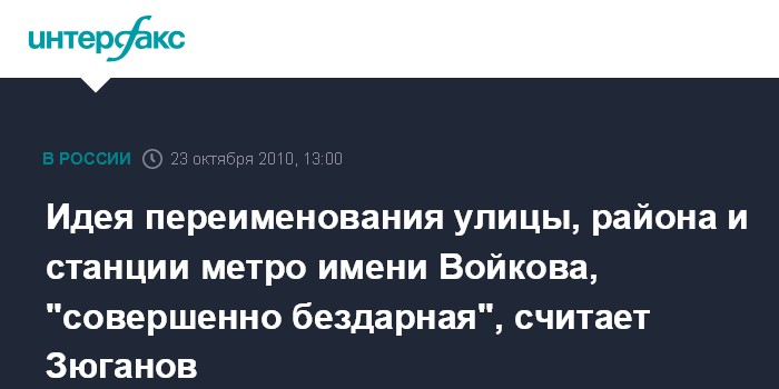 Идея переименования улицы, района и станции метро имени Войкова, "совершенно бездарная", считает Зюганов