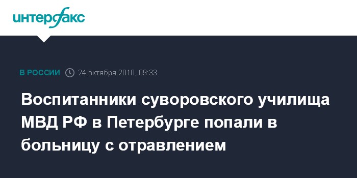 Москва. 24 октября. ИНТЕРФАКС - 11 студентов Санкт-Петербургского суворовского училища МВД России госпитализированы с признаками пищевого отравления, сообщил "Интерфаксу" источник в правоохранительных органах в воскресенье.