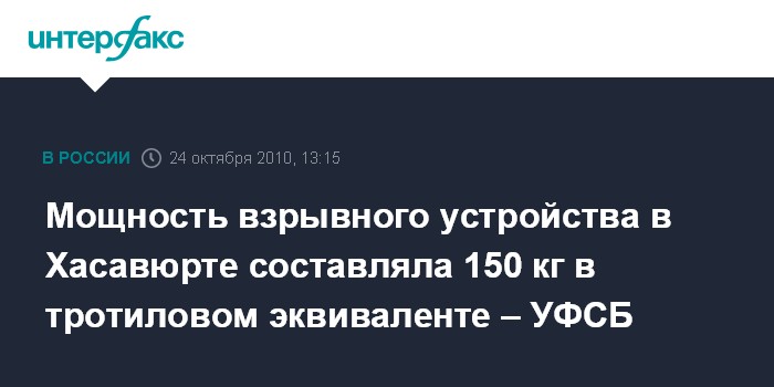Махачкала. 24 октября. INTERFAX.RU - Эксперты-взрывотехники установили мощность взрывчатки, заложенной в автомобиль УАЗ, взорвавшийся в субботу на территории милицейского подразделения в Хасавюрте, сообщили "Интерфаксу" в пресс-службе УФСБ России по Дагестану. "Мощность заложенного в машину взрывного устройства составляла 150 кг в тротиловом эквиваленте", - сообщил "Интерфаксу" представитель пресс-службы УФСБ по Дагестану.
