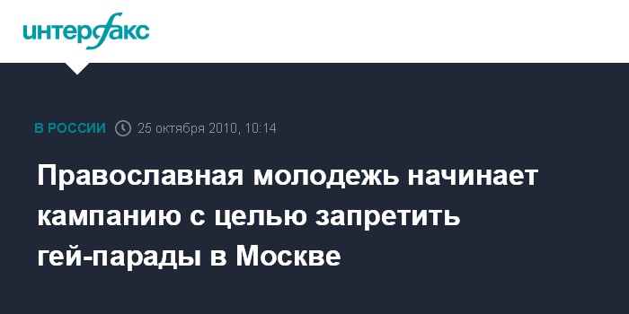 Москва. 25 октября. INTERFAX.RU - Православное молодежное движение "Георгиевцы!" при поддержке ряда общественных организаций начинает масштабную кампанию против решения Европейского суда по правам человека о незаконности запрета гей-парадов в Москве.