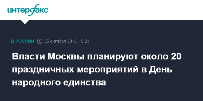 Москва. 25 октября. INTERFAX.RU - Около 20 городских мероприятий, посвященных празднованию Дня народного единства, пойдут в Москве 4 ноября, сообщили "Интерфаксу" в городской администрации.