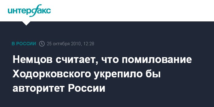 Москва. 25 октября. INTERFAX.RU - Сопредседатель движения "Солидарность" Борис Немцов призвал президента России использовать свое конституционное право и помиловать экс-главу НК "ЮКОС" Михаила Ходорковского и бывшего руководителя МФО "МЕНАТЕП" Платона Лебедева.