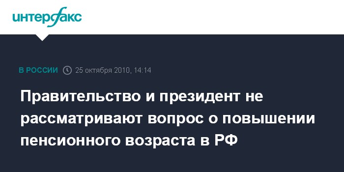 Горки. 25 октября. INTERFAX.RU - Ни правительство, ни президент пока не рассматривают вопрос о повышении пенсионного возраста, сообщила министр здравоохранения и социального развития Татьяна Голикова.