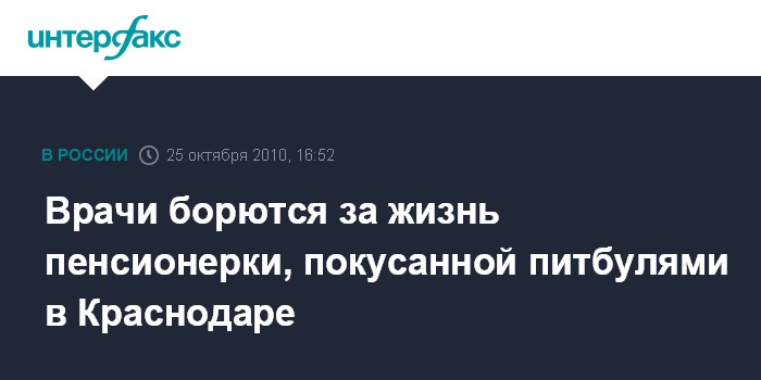 Краснодар. 25 октября. INTERFAX.RU - По уточненным данным, пожилая женщина выжила после того, как на нее напали два питбультерьера во дворе частного дома в Краснодаре, сообщили агентству "Интерфакс-Юг" в пресс-службе ГУВД по Краснодарскому краю в понедельник.