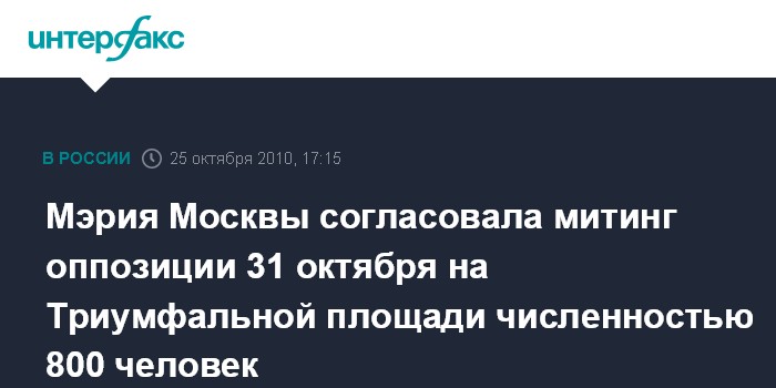 "В понедельник глава Московской Хельсинкской группы Людмила Алексеева побывала в мэрии, с ней был согласован митинг оппозиции на Триумфальной площади численностью 800 человек", - отметил собеседник агентства.