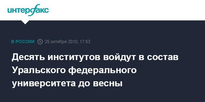 Екатеринбург. 25 октября. INTERFAX.RU - Десять институтов до 1 февраля 2011 года войдут в состав Уральского федерального университета (УрФУ). Пресс-служба университета сообщает, что данные институты будут созданы в рамках объединения УрФУ и УрГУ.