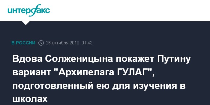 Идею включить "Архипелаг ГУЛАГ" в школьную программу для старшеклассников В.Путин высказал в июле прошлого года, когда встречался с Н.Солженицыной в стенах Дома правительства.