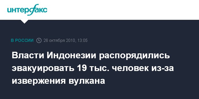 Сингапур. 26 октября. INTERFAX.RU - Индонезийские власти распорядились эвакуировать 19 тыс. человек из региона, в котором началось извержение вулкана Мерапи, на острове Ява, сообщил во вторник вэб-сайт сингапурской газеты "Стрэйтс таймс".